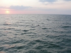 船上よりイルカを眺めロマンチックな夕日を鑑賞
