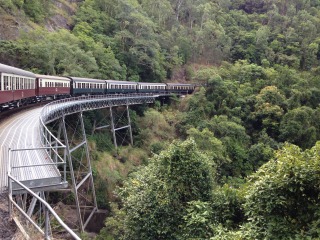 キュランダ鉄道は指定席になっているため心地よい風がはいり、また、世界の車窓からでも出ていた滝や橋ではゆっくり走ってくれるので
