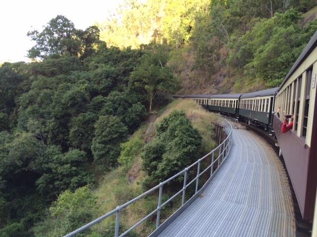 帰りはキュランダ観光鉄道です。車窓の景色を撮りながら、ワクワクして乗車していました。途中、バロン滝駅で停車しました。下車し滝を見ましたが、絶景ですね。自然って凄いと思いました。ストーニークリーク滝駅とレッドリッチ駅の間に前の車両が見えるくらいのカーブがあり、そこが撮影スポットのようで皆写真を撮っていました。私もバッチリ撮りました!世界の車窓からのメロディが頭の中で流れていました。このツアーは絶対オススメです。