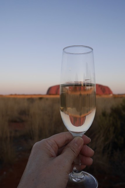 サンセット会場ではスパークリングワインやビールなどの飲み物とクラッカーなどの軽食が用意され、それらを嘱しながら夕陽や夕陽に照らされたウルルを見物しました。日没後、サンセット会場近くのディナー会場に移動し、アナング族(アボリジニ)の演奏を聞きながらカンガルーのステーキなどが用意されたブッフェ形式のディナーを楽しみました。ディナー中は参加者同士が丸テーブルを囲む形になるので、国籍関係なく英語で会話しました。私はあまり英語が得意ではありませんでしたが、一緒の食卓を囲みながらの団欒はとても良い経験になりました。