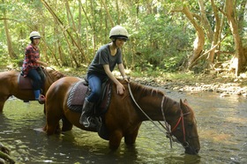 ツアー出発後10分後ころに、熱帯雨林の中へ。その脇を緩やかな川が流れていて、川の中を下るように乗馬を続けます。