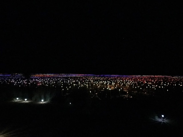 お代わり自由なのでついついおかわりが進んでしまうのですが、トイレは遠くにあるので要注意です(笑)。フレンドリーなスタッフがサーブしてくれて楽しめました。日が沈みきる頃に、丘の下にあるフィールド・オブ・ライトの会場からぼんやり浮かんでくる明かりは、とても不思議な感覚でした。真っ暗になると、まるで言霊(日本的な表現だと、これが一番的確かと)が浮いているようで、なんとも幻想的でした。ライトはLEDのようですが、月明かりの方が明るいくらいです。手ぶれをおこしやすいので、デジカメだと三脚が必要になるのでスマホでの撮影の方がいいと思います。正直、エアーズロックは暗闇の中に消えてしまうので見えませんが、周りに光源が何もない砂漠地帯で、星空と月、そして地上の光の草原のコラボは心に残る風景になること間違いなしです。