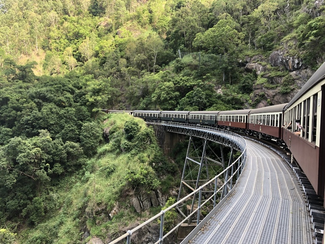ツアーで事前予約をしているのでスカイレールの長い列で待つことなくスムーズに乗り込むことができました。キュランダまでのスカイレールは2回乗り換えをして行きました。その2回の乗り換えでも熱帯雨林内を散歩できるコースが整備されていて滝や熱帯雨林を感じられるスポットで良かったです。キュランダに到着してからは村の散策をし、14:30のケアンズ駅行きの鉄道に乗りました。鉄道は山の高いところからゆっくりと時間をかけて下山していきました。途中名所となる滝に止まったりひらけた場所から見える山々は圧巻でした。また、ゆっくりくつろげるよう途中で席の移動をさせてくれた心遣いも嬉しかったです。鉄道での下山には少々時間がかかりますが、ゆっくりとケアンズの雰囲気や自然を楽しむことができた贅沢な時間でした。