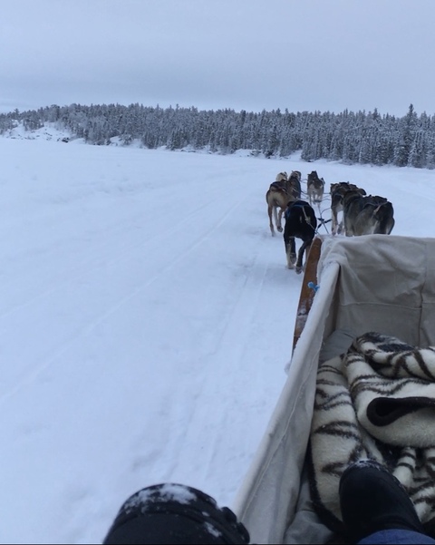 (年始早々のお仕事だったからなのか、運転手さんの機嫌が悪く、スタッフさんや参加者への態度がこわかったです。)広い湖の周りは雪で真っ白で、雪がほぼほぼ降らない地域に住んでいるわたしにとってはとても新鮮な景色でした。二人で行うのかと思っていたのですが、別の参加者と一緒でくっついて四人乗りでした。思っていたよりも小さなワンちゃんで、スピードは速くはなかったのですが12匹のワンちゃんが一生懸命走ってくれました。一番後ろの一匹のワンちゃんがちょくちょく後ろをチラ見していて、可愛かったです(笑)極寒の中、雪も降っており、故障が心配で持って行かなかったのですが、犬ぞり中、シータで撮っていたらさぞかし映えただろうと今更ながら後悔しています。オーロラツアーのついでのアクティビティでしたが、とてもいい体験でしたし、申し込んで本当に良かったです。