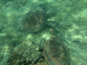 着いてから3時間ほどは日本では経験したことのない土砂降りでした。島での滞在時間が短かったら楽しめる時間も少なかったと思うと、色々想定しても島に滞在できる一番長い時間の船を選んでよかったです。雨が降ったおかげか快晴具合もものすごく、ツアーの沖合でのシュノーケリングでは亀を間近で見ることができました。