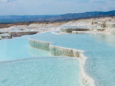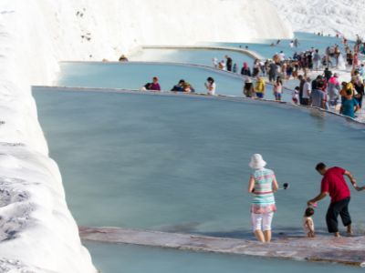 トルコ西部にある世界遺産「パムッカレ」は、白い石灰棚と温泉で知られる人気観光地です。